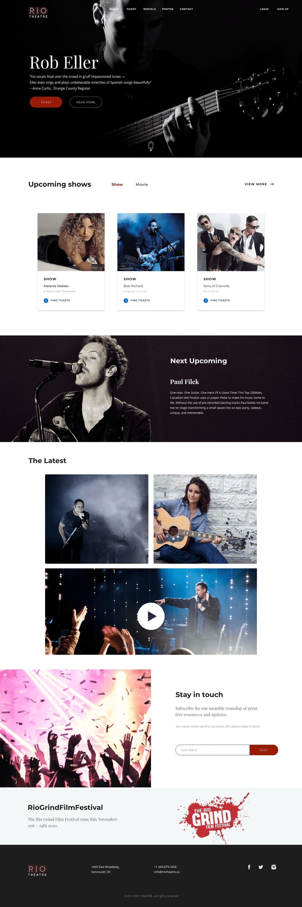 The main page of the website, where we can see upcoming shows and transitions to all sections of the website. It includes all main blocks what make the site navigation easier for users.