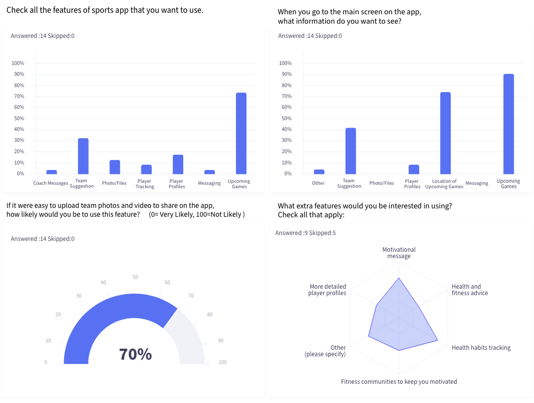 I conducted one survey with 14 participants, and six interviews with 6 potential users. I asked them about their pain points, needs, wants, and routine for their team.