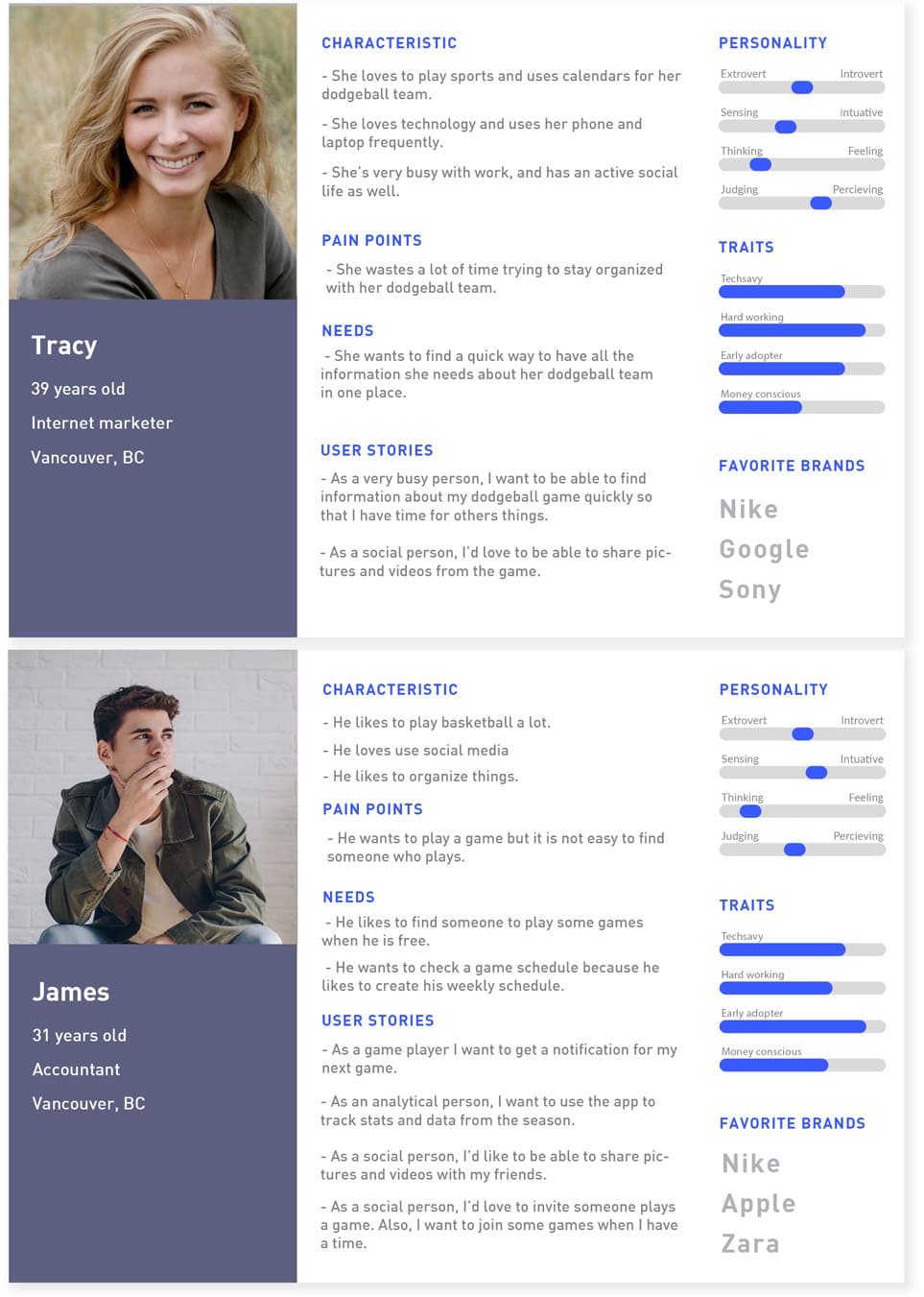Based on the research data collected, I identified two user types based on their interests and lifestyle. Furthermore, I tried to discover their needs, pain points, personality traits, and favorite brands.