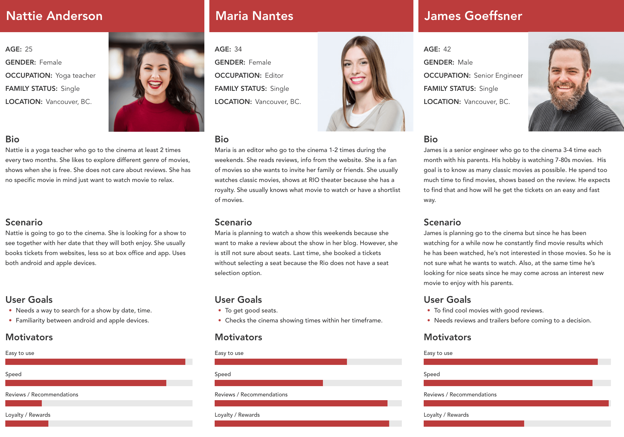 In order to build realistic user stories, I surveyed 8 people, aged between 21 to 45, who go to the cinema at least once every two months. The questions focused about the last time they went to the cinema. Main takeaways:
